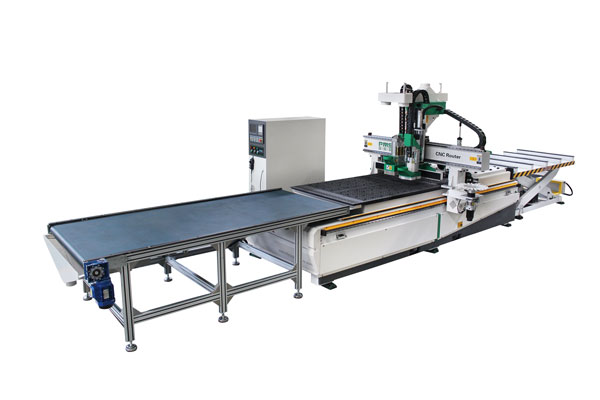 ,當需要換刀時,當前的機頭上去,需要的機頭下來繼續雕刻。木工加工中心是僅有一個機頭,但是他擁有一個刀庫,不同機型有不同的刀庫容量,有8把、12把等,根據刀庫的形狀和換刀方式有盤式換刀、斗笠式換刀、排式換刀等,換刀時,機頭移動至刀庫,選擇好需要的刀具,回來繼續雕刻。