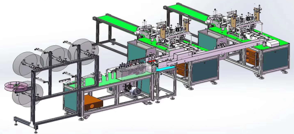 品脈數(shù)控研發(fā)設(shè)計(jì)的全自動(dòng)高效口罩生產(chǎn)線,由原材料自動(dòng)輸送系統(tǒng)、折疊成型系統(tǒng)、耳帶熔焊系統(tǒng)、下料系統(tǒng)組成;適用于多層PP無紡布、活性炭以及過濾材料,通過超聲波熔接和自動(dòng)封邊,完成平面口罩從原材料卷料到口罩成型的整個(gè)生產(chǎn)過程,實(shí)現(xiàn)口罩生產(chǎn)從材料到成品的全自動(dòng)化,每小時(shí)可產(chǎn)口罩達(dá)6000~8000只。