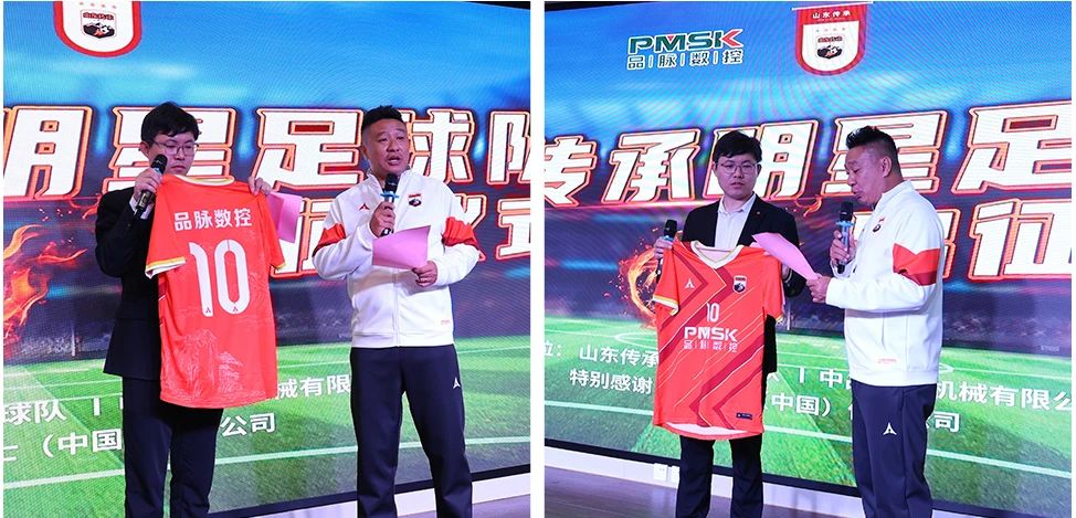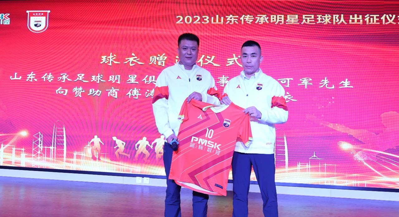 山東傳承足球明星俱樂部董事長察可軍向贊助商傅濤董事長贈送球衣