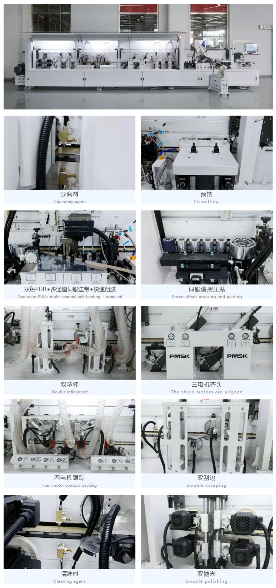 多通道伺服送帶,不同封邊條快速切換,伺服送帶減少封邊帶浪費,提升封邊穩定性和效率。伺服涂膠,動作快速精準,涂膠連續性好,穩定性高。