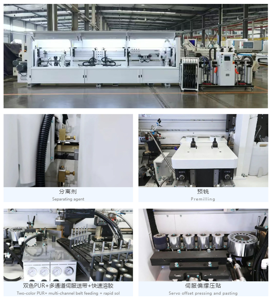 The servo-regulated pressure beam structure enables precise control, allowing for rapid adjustment of edge banding for plates of different thicknesses.